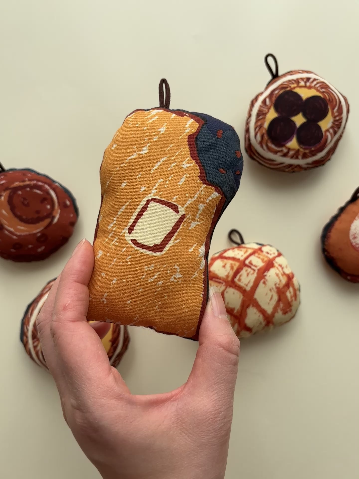 メロンパン、クロワッサン、ダークチェリーなど、人気のパンたちがかわいらしくオーナメントになりました。ふんわりとした中綿入りで、少し光沢感のある質感です。お好きな紐を通してクリスマスツリーに飾ったり、バッグに付けてキーホルダーにしたり、自由に楽しめます。
