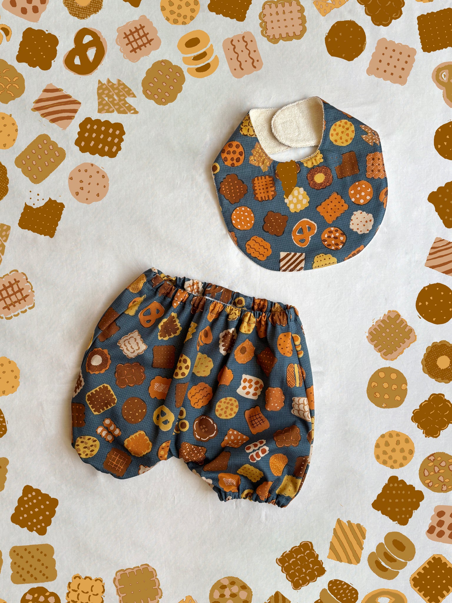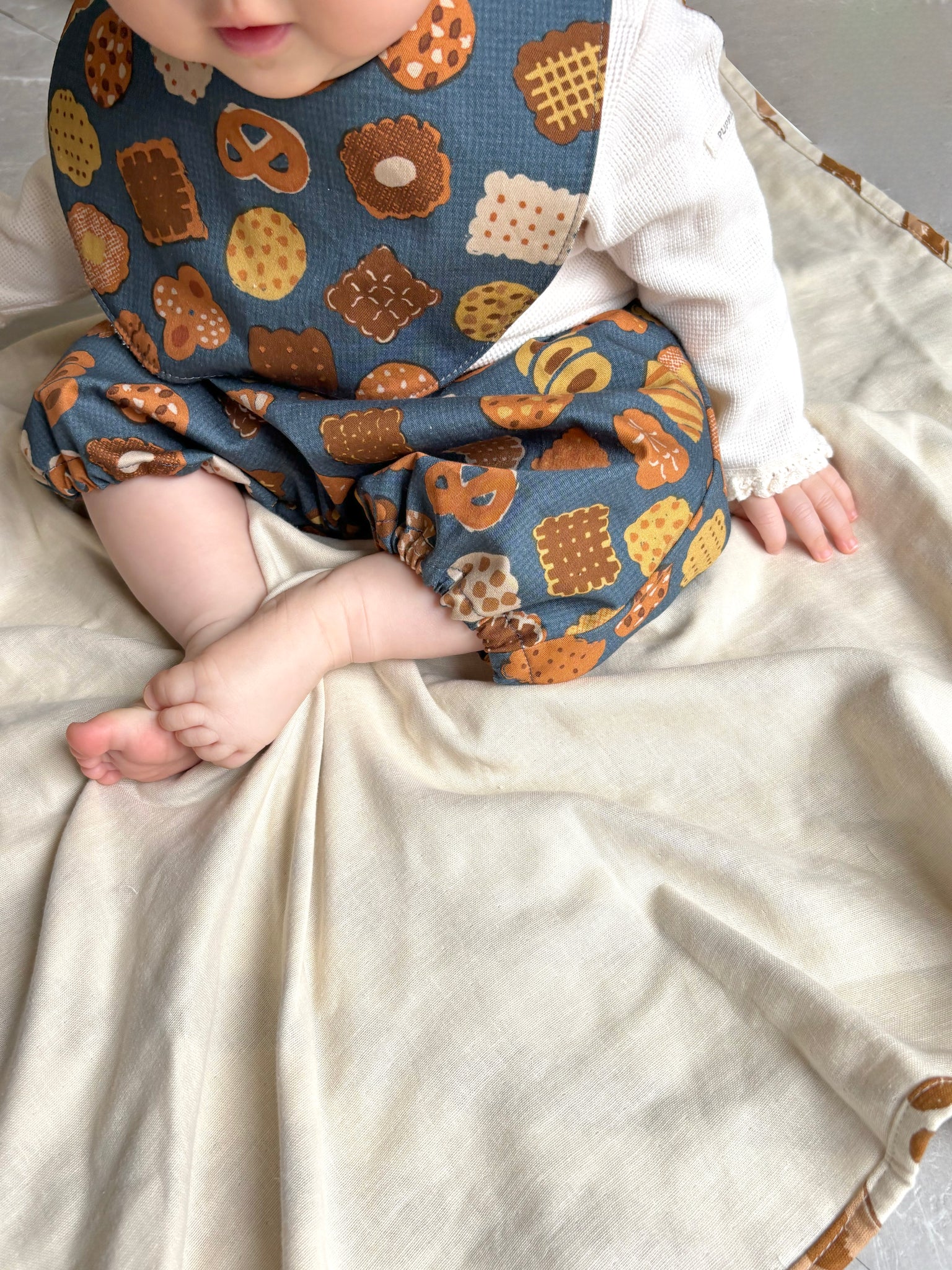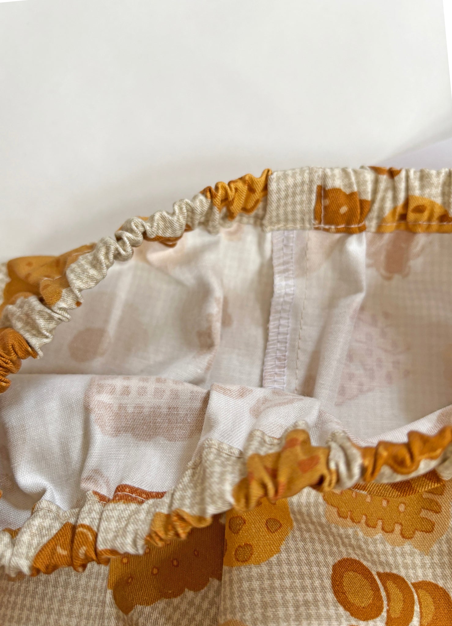 クッキー柄には高密度でほどよくハリのある中厚生地バーバリーを、ミニバゲット柄にはふんわりやさしい肌触りのトリプルガーゼを使用しています。