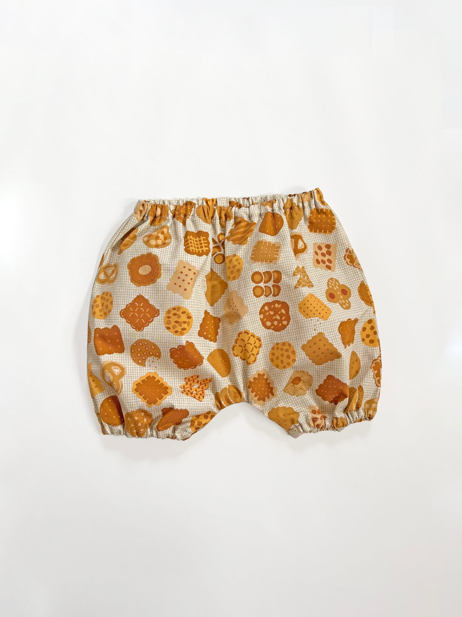 同柄のベビースタイとセットで合わせても可愛く、低月齢の頃はひざまで隠れるパンツとして、成長後はブルマとして長くお使いいただけます。(目安:6ヶ月〜18ヶ月ごろまで)