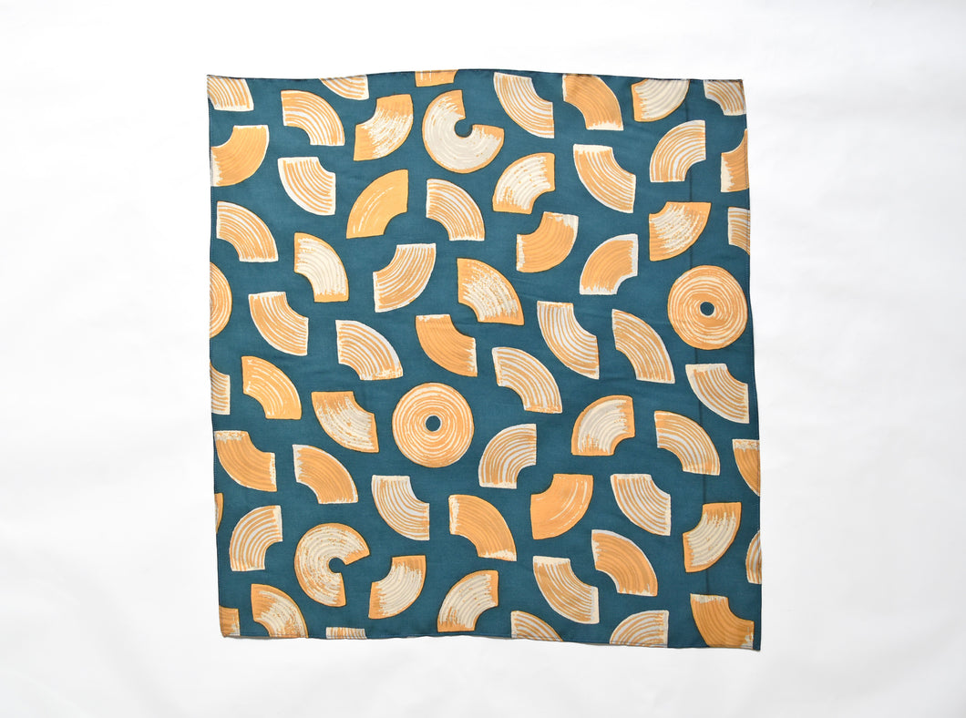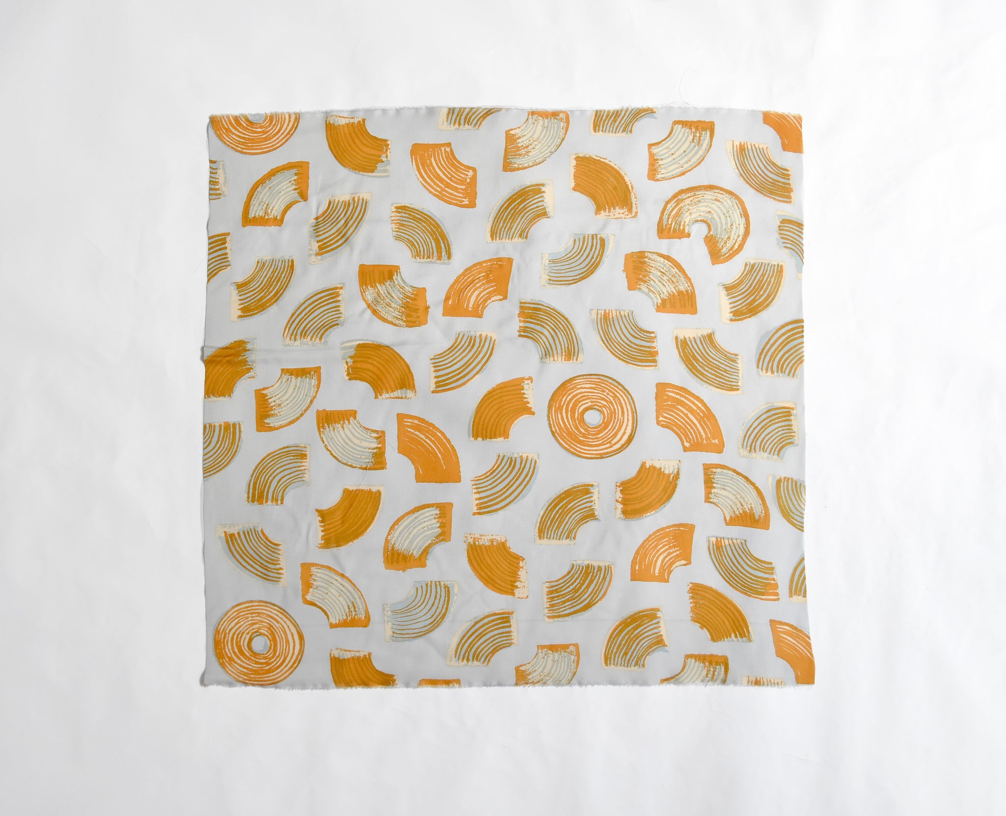 ハンドのシルクスクリーンプリントによって染められた生地です。色の重なりによって微妙な色の深さや滲みが特徴的です。