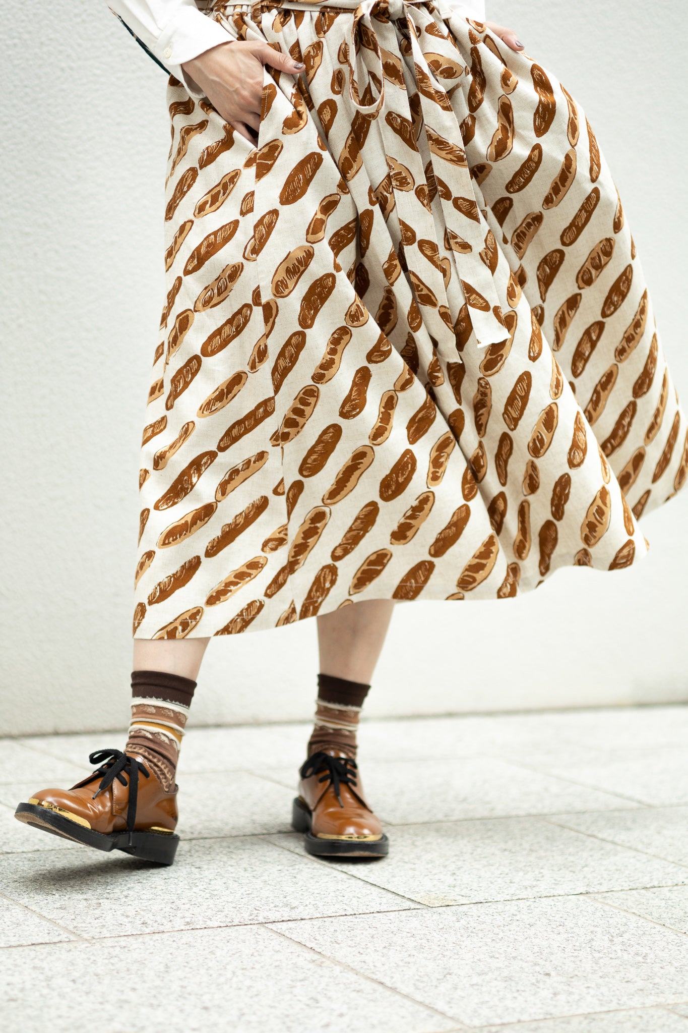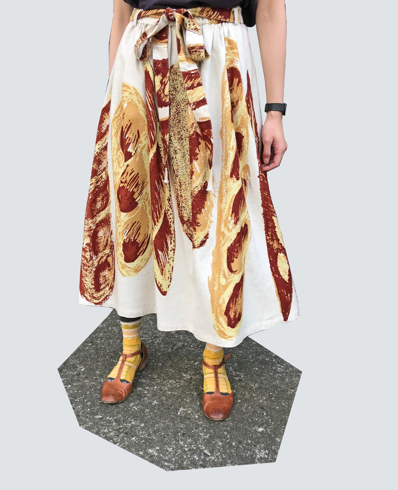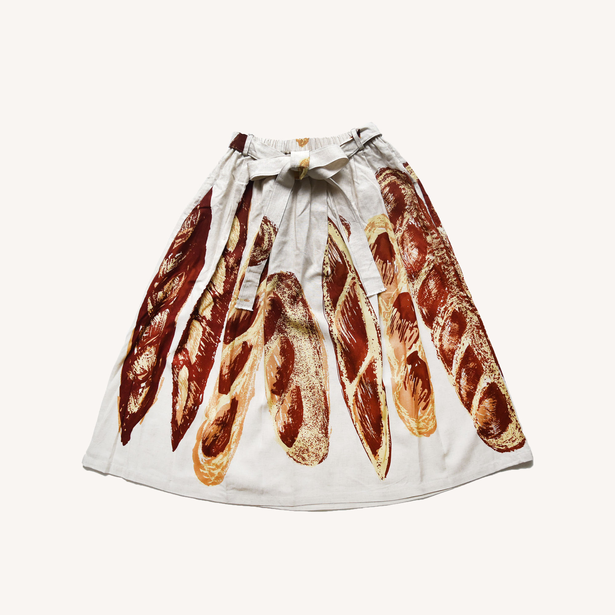 ゆったりしたサイズ感で、ウエストに一周ゴムが入っていて気軽で楽ちんです。 ベルト内側にウエスト調整できる紐付。 肌当たりが良い柔らかな綿ヘリンボンテープを使用。 便利なサイドポケットがついていてデイリーに活躍してくれそうなスカート。